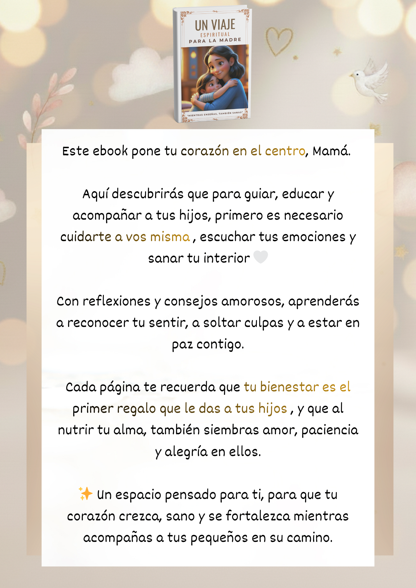 Este ebook pone tu corazón en el centro , Mamá. Aquí descubrirás que para guiar, educar y acompañar a tus hijos, primero es necesario cuidarte a vos misma , escuchar tus emociones y sanar tu interior.
